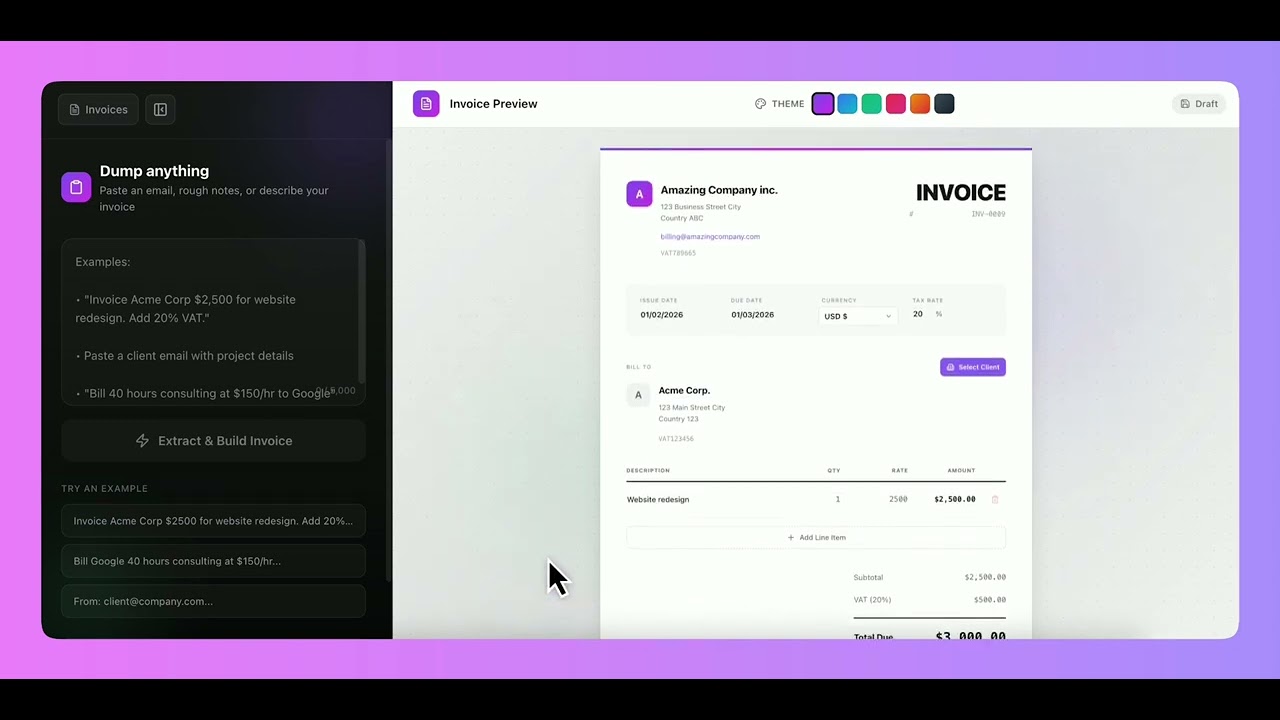 Drop in an email thread, rough notes, a Slack message, or just type 'Invoice Google $500'. We handle the mess.